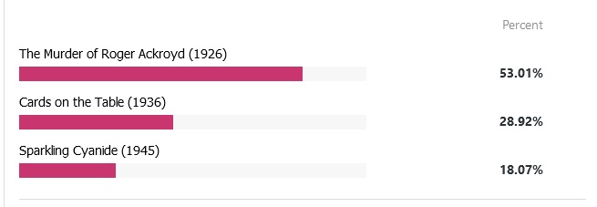 Back in October, when Brad, Moira, and I discussed The Murder at the Vicarage (1930) by Agatha Christie in spoiler-rich detail, we each picked another title by Christie for the succeeding discussion, due to be held and posted in January 2021, and left it up to you to vote for the one you’d like us to talk about. It was a straight choice between The Murder of Roger Ackroyd (1926), Cards on the Table (1936), and Sparkling Cyanide, a.k.a. Remembered Death (1945) and here’s how that vote went: