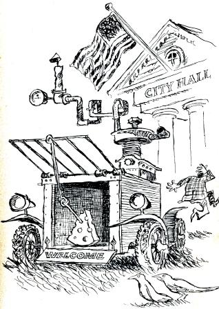 First ‘The Case of the Giant Mousetrap’, in which “unemployed inventor and artist” Salvatore Custer creates a monstrosity of a motorised mousetrap, parks it on the lawn outside City Hall when no-one wishes to accept it, and then loses the key so that no-one is able to move it. Encyclopedia’s conviction that the key can indeed be found relies on a reversed logical necessity that I’m not sure passes muster, however — an equivalent might be that a Keep Off the Grass sign implies the presence of grass, but the presence of grass does not automatically mean there will be a sign there telling you to keep off — and so the reasoning does not work for me here. Man, I am hard to please.