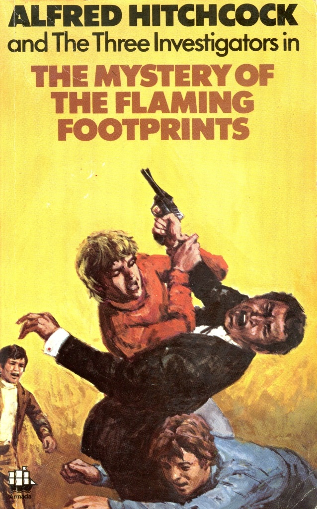 Carey also seems wise to the sort of peril the boys have found themselves in over the last seven years and ups the ante with a borderline torture sequence and the boys wrestling with an armed man at one point (as shown on the cover of my Armada edition, above). It’s all rather more mature than the “Zoinks, Scoob!” tone of previous book The Mystery of the Coughing Dragon (1970) where — er, spoilers? — something that would absolutely not fool anyone into thinking it was a dragon managed to scare these three straight for a distressingly protracted time. Here, we’re doing away with such childish things, even to the extent that when the eponymous footprints mysteriously appear in The Potter’s house: