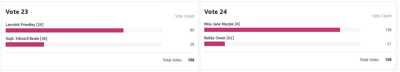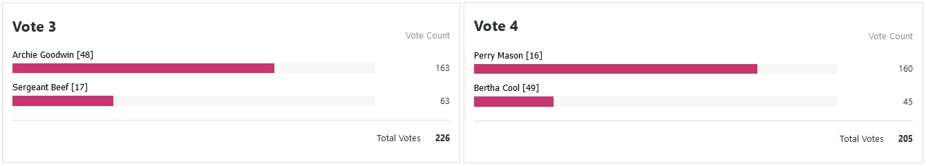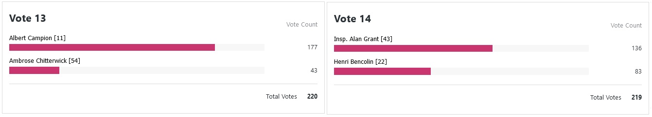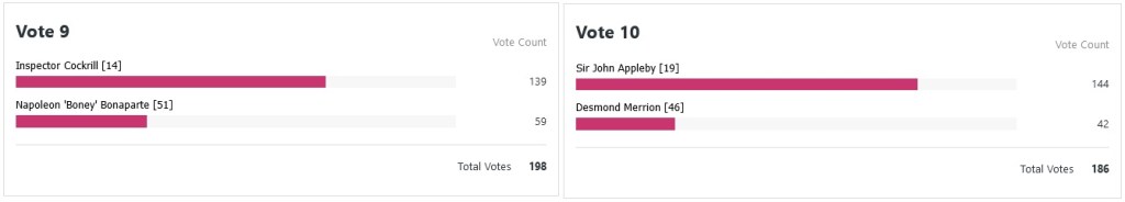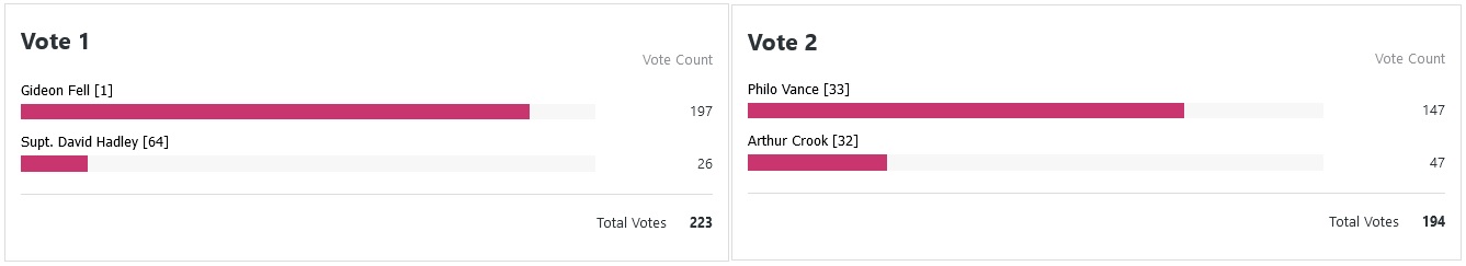 Ahhh much more closer decisions to choose from this time around. Father Brown still in is great, love it. Only real upset for me here was Alan Grant beating Bencolin, not something I would’ve predicted. Excited to see what happens next.