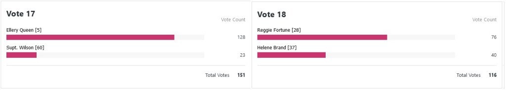 Fan I may well have become of Craig Rice’s John J. Malone novels, but I didn’t expect the lawyer to do brilliantly in this vote…and, sure enough, he was taught a lesson by Inspector Richard Queen..albeit with the fewest total votes of any of the top half run-offs. And John Rhode/Miles Burton’s Bright Young Men continue to fare poorly…but did anyone expect Jimmy Waghorn to triumph against M. Hercule Poirot? Well, 15 people did, but they’re perhaps the only ones.