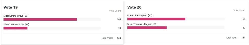 Yes, the Continental Op failed to prevent Nigel Strangeways making his way through, I’m afraid, leaving you hardboiled nuts with only Marlowe to root for. And am I the only one surprised at how close the match being Roger Sheringham and Thomas Littlejohn went? I suppose Littlejohn’s case is boosted by a lost of recent reprints, but I expected Roger to trounce him.