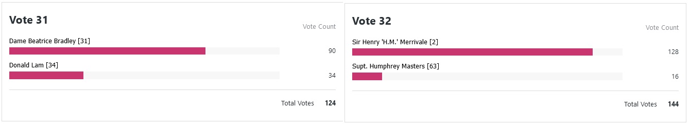 Presence in the mind of the average reader no doubt goes a long way, with my mate Edward Beale failing to stir much resistance against the Dr. Lancelot Priestley — frankly, I was delighted that Beale got the three votes he did to even get him into the poll in the first place. And did we really think Bobby Owen stood any sort of chance against Aunt Jane?
