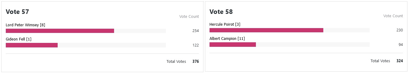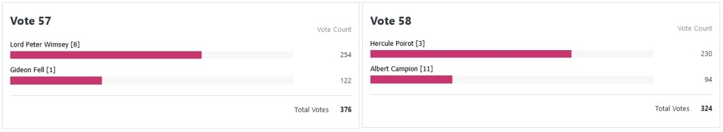 Yes, that seismic juddering you feel is the resounding crash of the gargantuan number one seed Dr. Gideon Fell being knocked from his perch by the always-dangerous Lord Peter Wimsey. Personally, I’m devastated — I’ve never made a secret of Fell being my favourite GAD sleuth — but from a results perspective I can’t deny that I love an upset, and I consider this to (almost) be one. Wimsey’s been very popular round-by-round, frequently pulling in huge numbers compared to his competitors, so this was always on the cards, even if I think you’re mad for making it happen. And on the other side, did anyone really expect Albert Campion to beat Hercule Poirot? The little Belgian is popular for a reason, and I have a feeling this vote might go down to the wire…