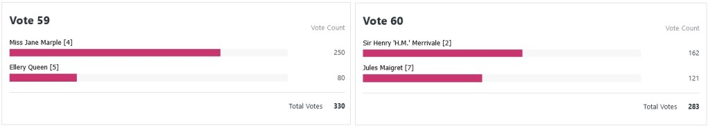 I anticipated that crime-solving spinster Miss Jane Marple would probably see off Ellery Queen, but never in my wildest imaginings did I think that the margin of victory would be quite so wide. Equally, I thought Carter Dickson’s barrister-cum-impossible-crime-unpicker H.M. would trounce the realism-focussed Jules Maigret…and that actually ended up a pretty close-run thing. Nice to see H.M. polling more than his usual 128 votes, but this was still the least-contested of the four votes in the last round…so did people just not think it worth voting in? Overall the numbers are up, however, suggesting that some of you have waited until this late stage when the votes might be closer to pitch in for your favourite. Keep at it, I say! Nothing is certain any more!