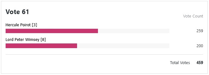 I foresee very close results with this! My choice is an obvious one, but I feel that in recent years the tide has somewhat turned on which of Christie’s detectives is the preferred. The outcome will be very interesting in that respect.