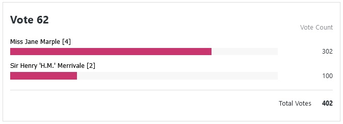 Of course, everyone knew it was going to be an Agatha Christie vs. Agatha Christie final, didn’t they? Apart from those of you who knew it was going to be John Dickson Carr vs. John Dickson Carr. Or Carr vs. Christie. And it looked for a while like it might be Carr or Christie vs. Dorothy L. Sayers for a while…so while the results here aren’t perhaps entirely surprising, it’s certainly set up a vote that I’m keen to find out the answer to: given that they’ve both appeared in a positive swathe of multimedia presentations and so exposure can be taken out of the equation, and given that they both indulge in very different style of detection, who is the more popular of Christie’s two most famous sleuths?
