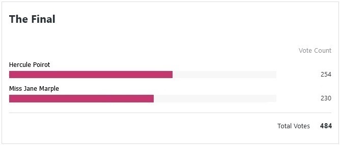 This was kind of inevitable, but I would liked to have seen Hercule Poirot or Miss Marple facing a non-Christie detective in the finals. Even then, Poirot or Marple very likely would have still won the poll. I think the only detective characters who could beat them are Sherlock Holmes and Lt. Columbo, but neither are Golden Age characters.