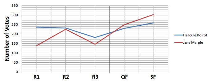 Our final, remember, was between Hercule Poirot and Jane Marple, and from this is seemed that Poirot started off the more popular but Marple got something of a boost as the rounds went on. Was there anything in that? Well, the head-to-head round-by round looks like this…