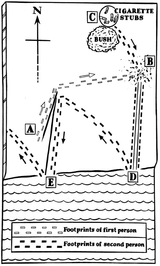 The map shows footprints and other marks on the wet sand of Berringer’s Beach [click on the image for a larger version]. Interpret them to answer the following questions: