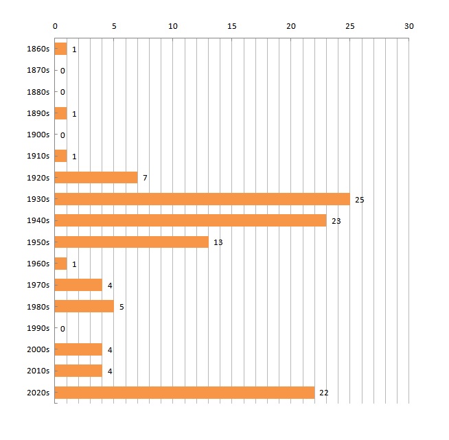 The decade-by-decade breakdown — excluding multi-author anthologies, whose publication date isn’t always a reflection of their contents — would then be: