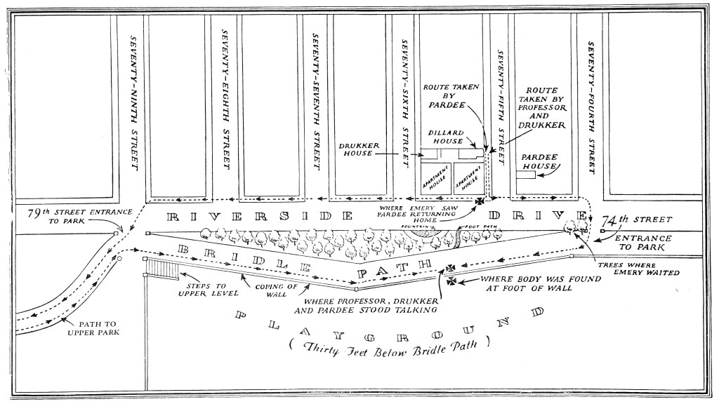 Once again, the solution is reached by wonky psychology and a complete absence of any actual clues, furthering my appreciation of Ellery Queen taking this as their model, because for all its success there is that very noticeable absence at the heart of these books. Markham remains stoic, Van Dine makes an amusing narrator — the footnotes remain entirely irrelevant to the plot, but crucial to enjoying the fun — and there’s something new in the denouement, I’ll give Van Dine that…even if I do wish he’d follow his own damn rules and actually include some evidence to point the reader to the guilty party for once. Also, thanks to Sergio’s review, I know that my Fawcett Gold Medal edition pictured above is missing this map, which is a shame if hardly crucial: