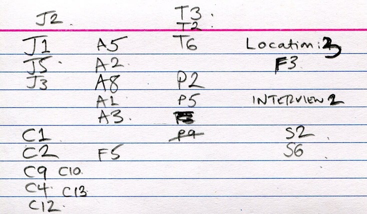 You’ll have a sense of how these things work, but just to be clear: at various stages, you will interview a suspect or have to make a decision about who to interview or what to do next, and the choice is then presented that you turn to a certain numbered section — the book is split into 200 of them — to see the consequences of that action. Along the way, this being a piece of detective fiction, you pick up clues which are given an alphanumeric label (J6, C12, etc.) which you’re asked to write down in your “notebook” (blank pages are provided at the back of the book, but I borrowed this form the library so used a piece of card) since possession of certain clues informs some of the later decisions.