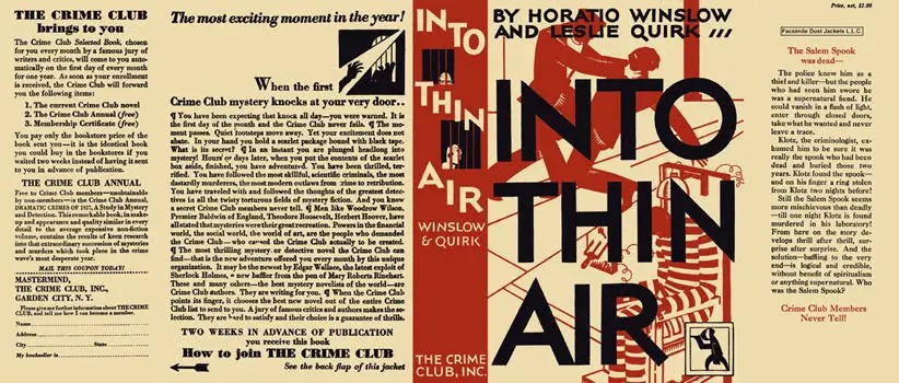 The Roland Lacourbe-curated list of 100 impossible crime novels has held quite a sway in my reading life. Hell, I got one of the titles on it reprinted purely so I could read it myself. Until John Pugmire’s death, Locked Room International did a stalwart job bringing many of the foreign-language titles into English…but still some books on the list seemed frustratingly out of reach, no more so than Into Thin Air (1928) by Horatio Winslow and Leslie Quirk.